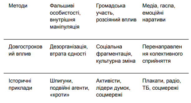 ● Деморалізація та дезорганізація: через поширення чуток, девіантної